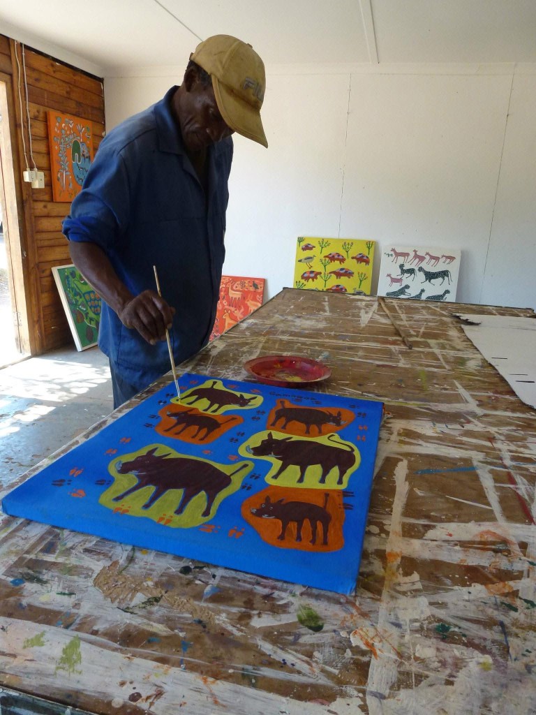 Time passed and several cats later, as clearly one wasn’t enough, and while working for a tea company in my 40’s, I came up with a stellar idea to set up a charity arm to my employer and give back to the part of the world from where the tea originated: southern Africa. I was responsible for setting up a fundraising campaign which ran in various guises for 16+ years,  raised money for boreholes for 10 villages for the Kalahari Bushmen, a school, an art & literacy project amongst others, and I had some of the most incredible life changing adventures in Namibia and Botswana. On one of them I was with a group from Barclays who were on a leadership management team building thing, during which we visited an art project in Botswana. I’d seen some of their work online before we went out, but seeing it in real life, meeting and talking to the artists, left a massive impression on me.
